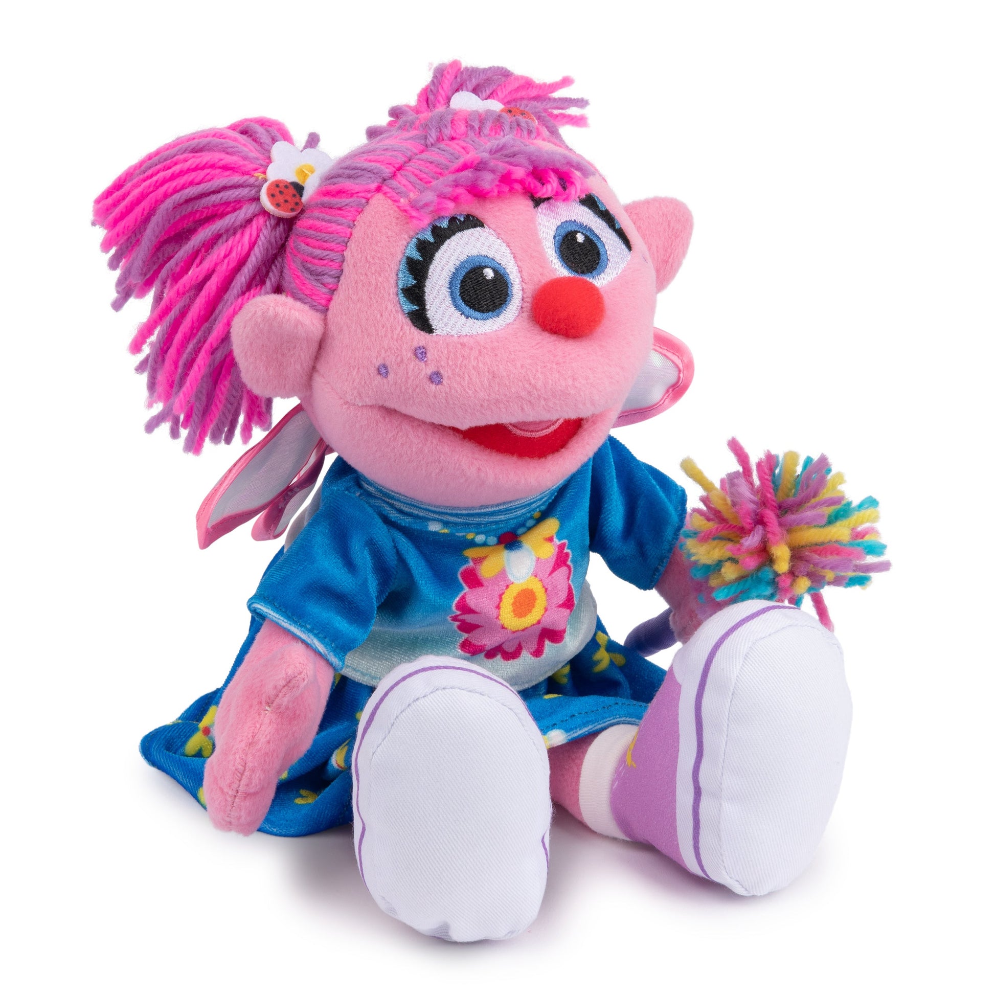 This adorable plush features Abby with sheer iridescent wings and a new flowery blue dress, complete with her purple wand, which features a multicolored sparkle pompom. She also features soft pink plush and her bright pink and purple hair in pigtails, with embroidered facial details and a soft, huggable body that makes her perfect for all ages 1 and up. This plush toy is surface-washable for easy cleaning and ships in a protective poly bag.