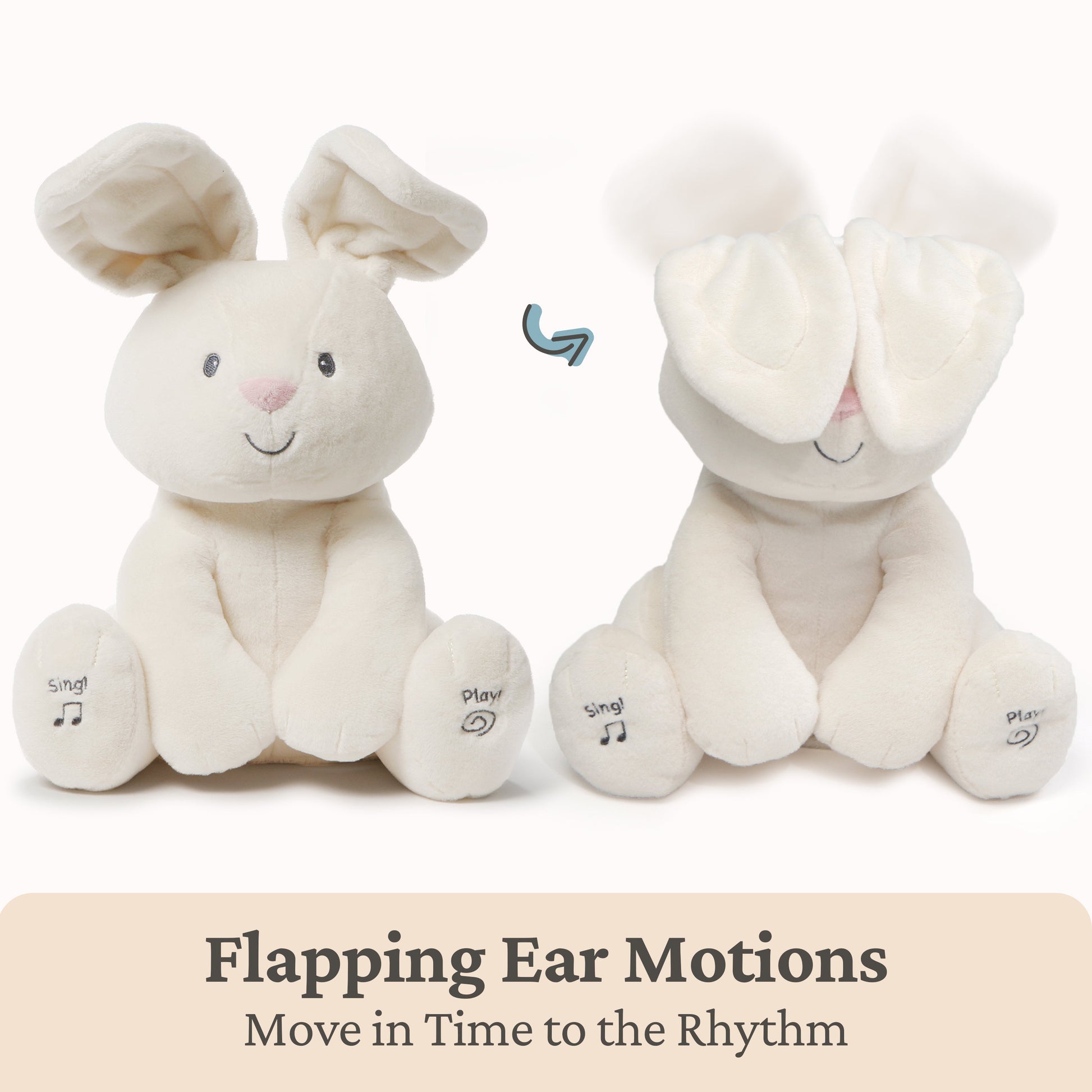 Flora is an adorable, soft cream and white singing bunny rabbit with two different play modes to engage and entertain baby, making playtime more exciting as they embrace tactile play. This Baby GUND favorite sings in a cute child’s voice and plays an interactive game of peek-a-boo with the press of a button. Press Flora’s left foot to engage her in an interactive game of peek-a-boo, where Flora hides behind her long, oversized ears. Press her right foot to sing along to a playful song in a cute child’s voice, while her ears flap in time to the rhythm! Flora also now features volume control for a more comfortable customized play session. Users can adjust volumes by holding either foot for three seconds. Hug and play along with the one and only Flora the Bunny!