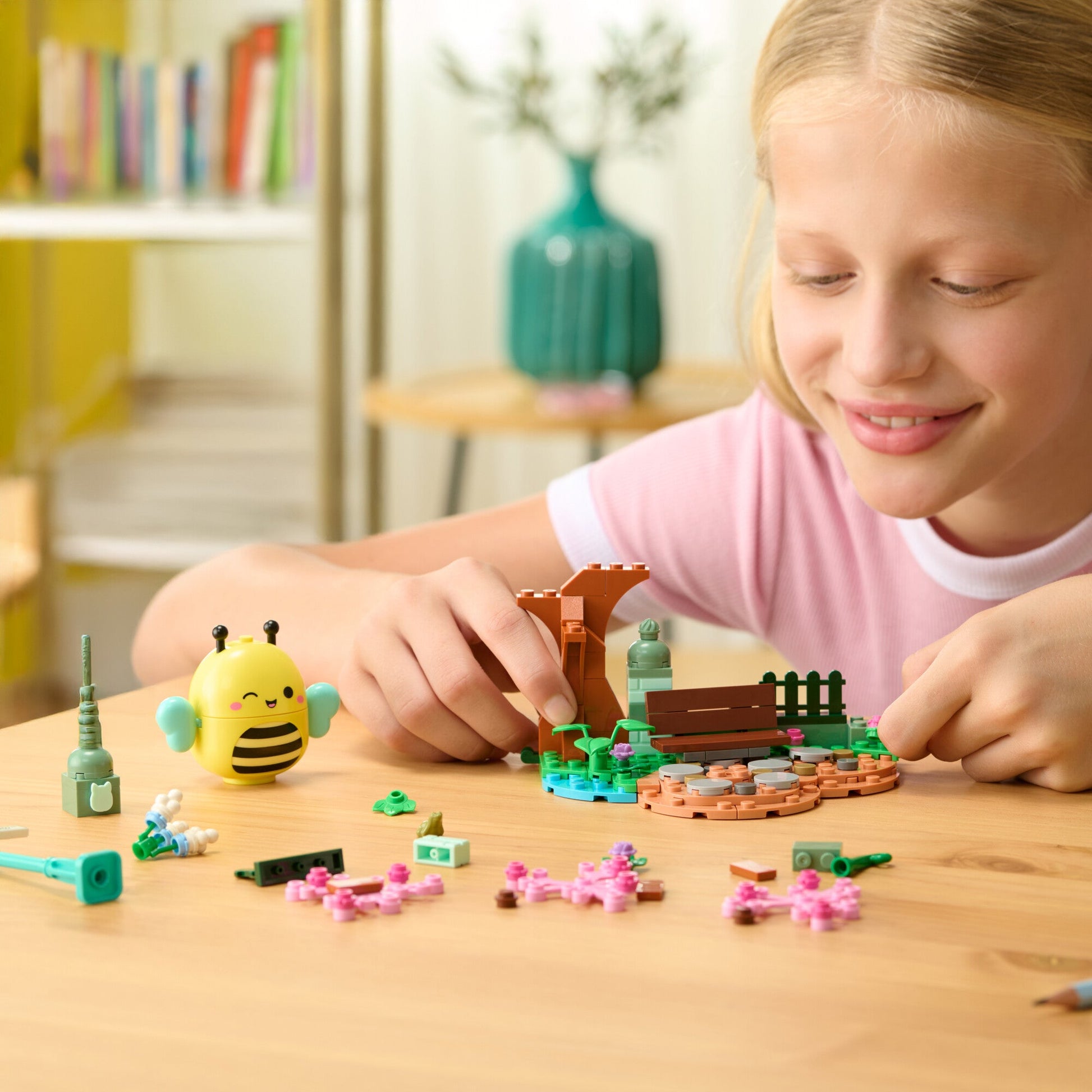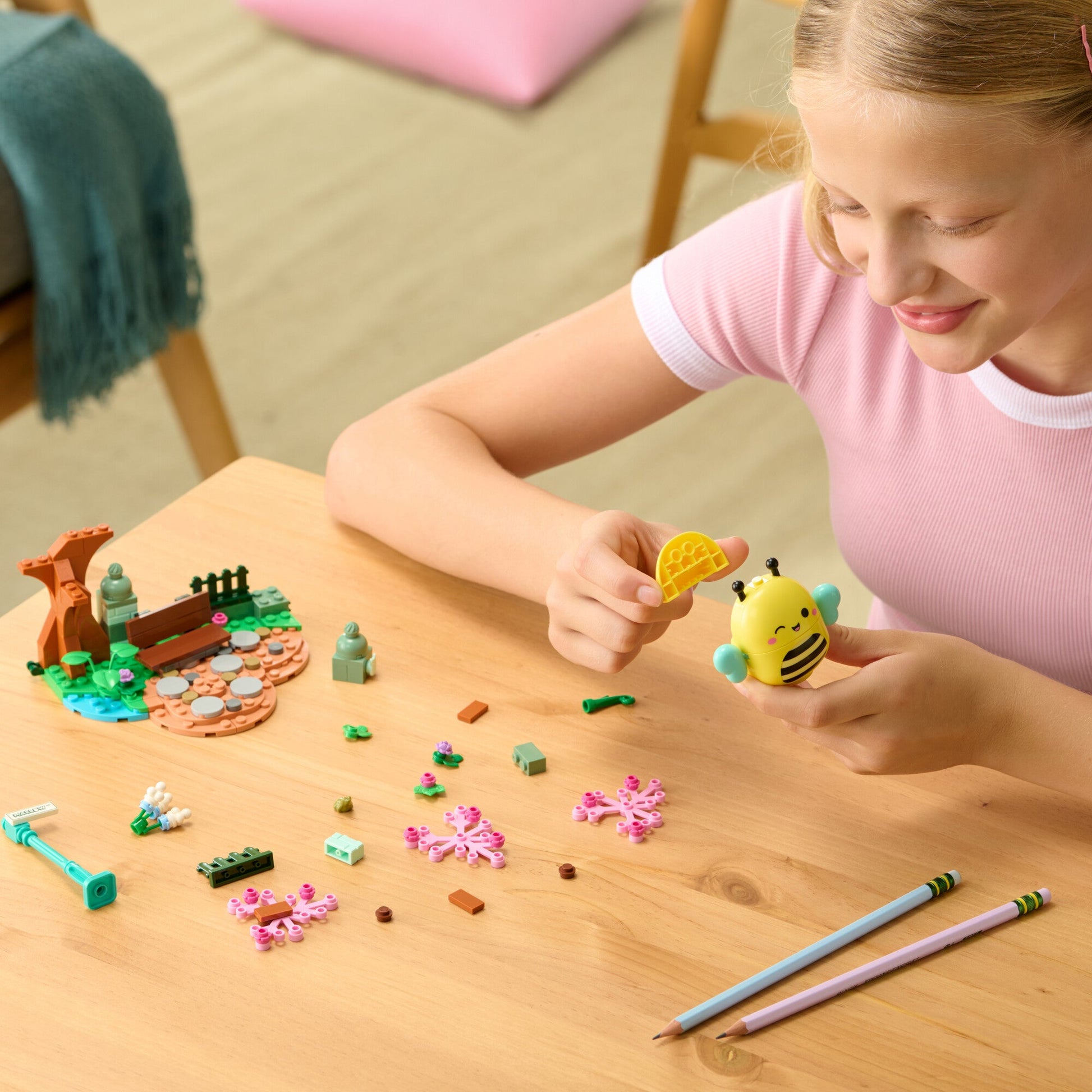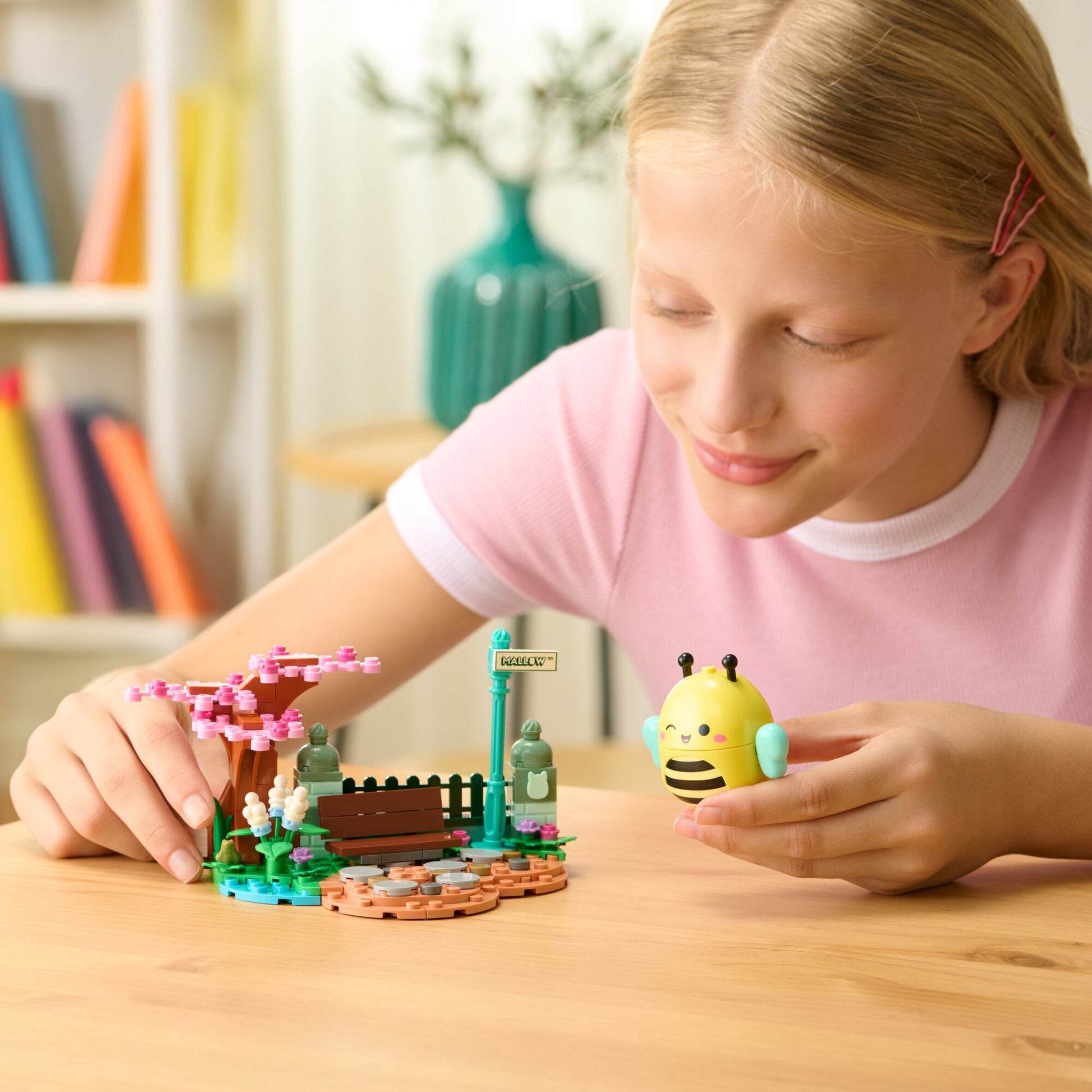 Play with or display the included Squishmallows buildable figure Sunny—featuring a squishable belly powered by SquishBrik by Original Squishmallows—gazing at the pond, people-watching on the park bench, or wherever your imagination takes you. BLDR bricks are compatible with all major construction brands, ensuring endless possibilities for creativity. Join the Squishmallows Squad with this exciting playset—perfect for kids and fans who love to build, imagine, and play!