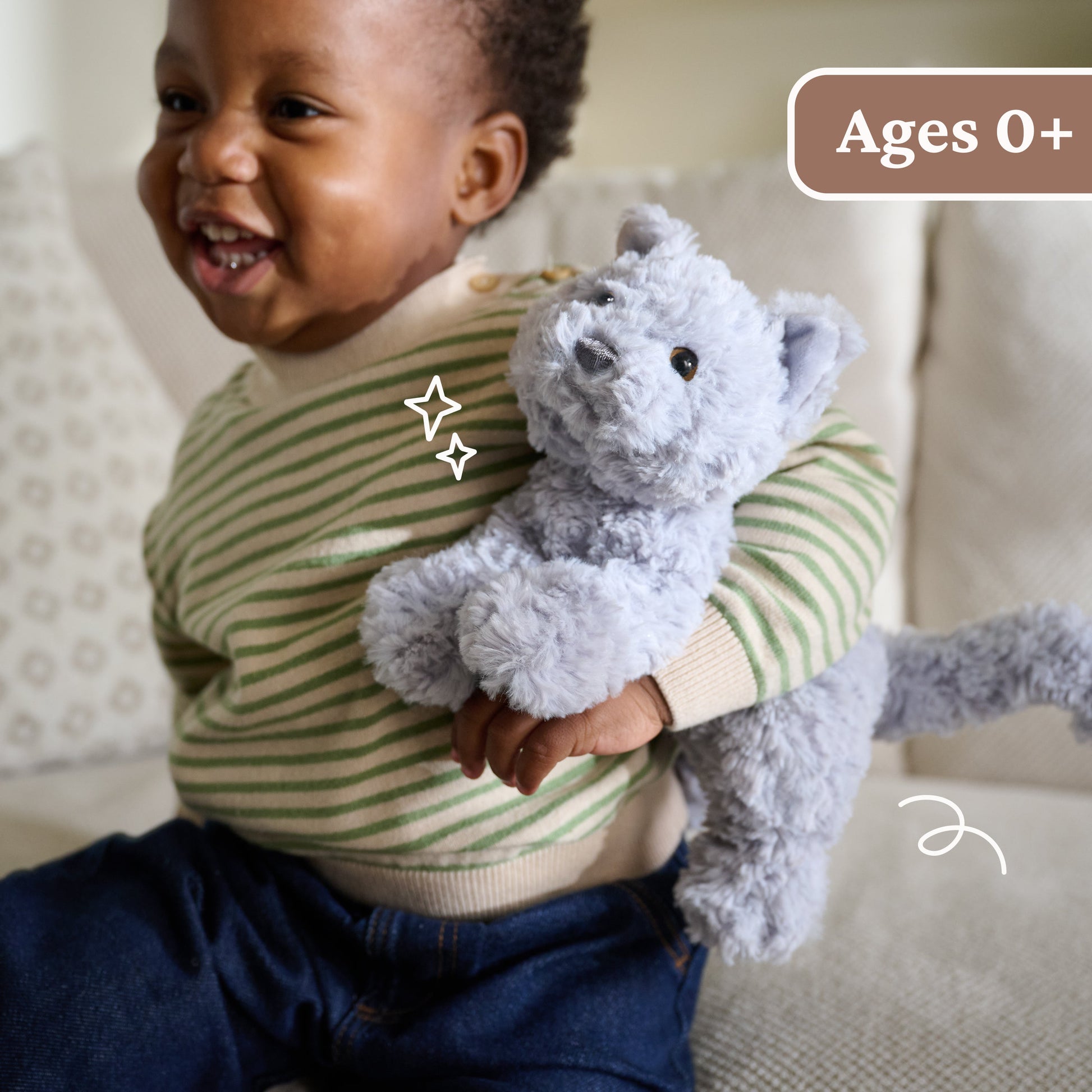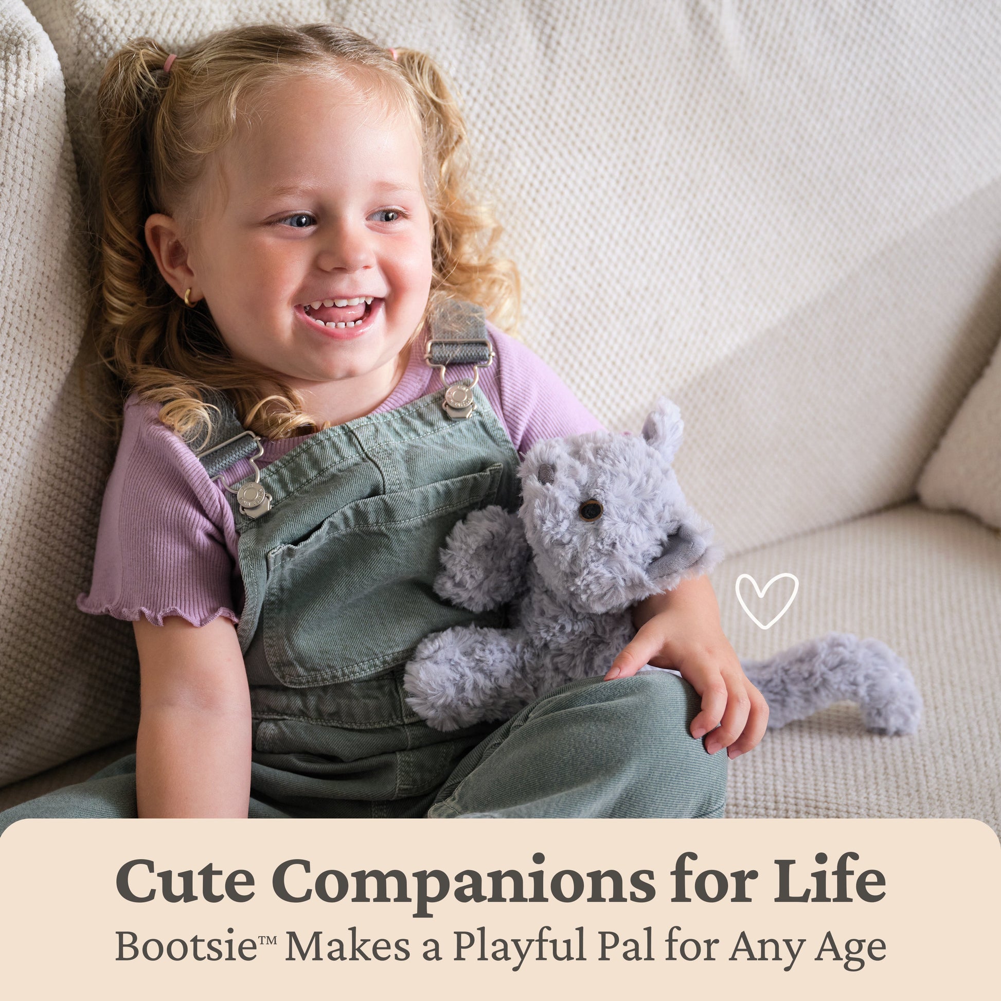 From cuddles to nose boops, Bootsie can’t wait to be your best friend! This precious English Blue kitten boasts bright golden-amber eyes, soft gray plush, and deeper gray accents on its velvety soft ears. Bootsie also features a threaded, deep gray nose and soft, thick swirls of plush fur. Bootsie sits on all fours in a pounce-ready pose, ready to play, snuggle in the crook of your arm for a good cuddle, or pose charmingly with its bean-filled paws. At 9 inches from paw to paw, this sweet, soft, bright-eyed kitten is also sized for big and little hands alike, meaning it’ll be there for bedtime cuddles, long car rides, and everywhere in between.
