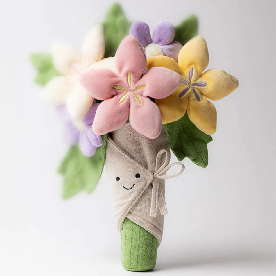 The Amuseables Bouquet of Flowers is the perfect way to say Thank You or Congratulations, or simply to cheer up a friend. A stunning bundle of fluffy blooms, with stitch centers, suedette leaves, petals in pink, cream, purple and yellow, embroidered stems and a hessian wrap, this bunch is blooming gorgeous.