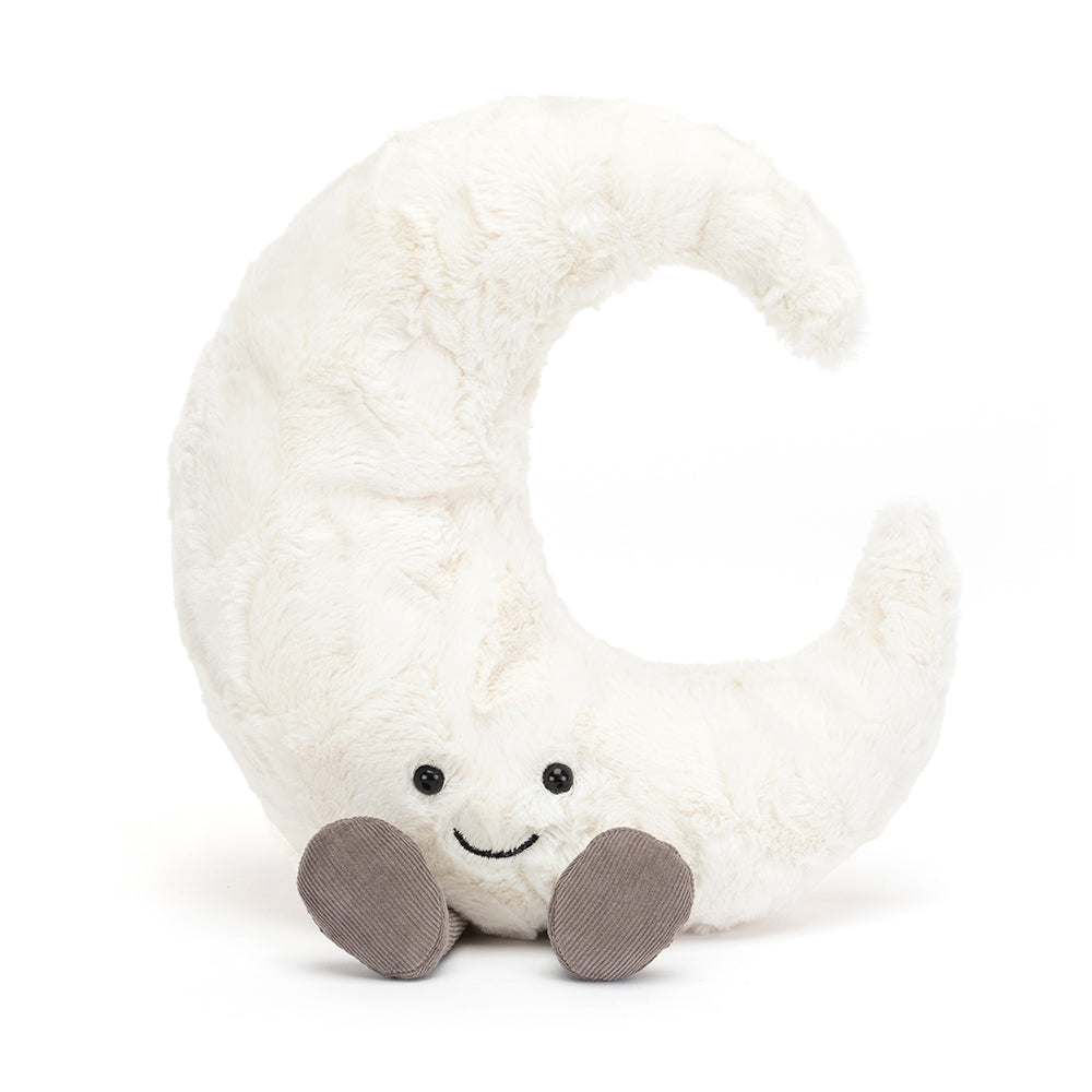 Gorgeously textured with velvety craters, Amuseables Moon is full of fun! A midnight matey for bedtime hugs, this pearly-white pal is curvy and cuddly. With squidgy cord booties, a weighted bottom and a peaceful smile, this moon's waxing poetic! A magical crescent and a marvelous present.