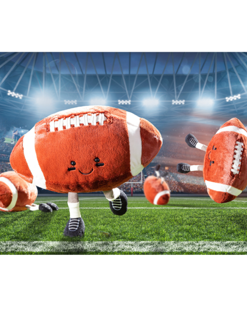 With silky soft tan-hued fur, cream suede lacing detail and soft stripes either end of this classically shaped sports favourite, Amuseables American Football is a captivating catch (and cuddle). Ready to run the field with a pair of cleats in suede with embroidery details and fine cord socks, it's poised to be a league winner!