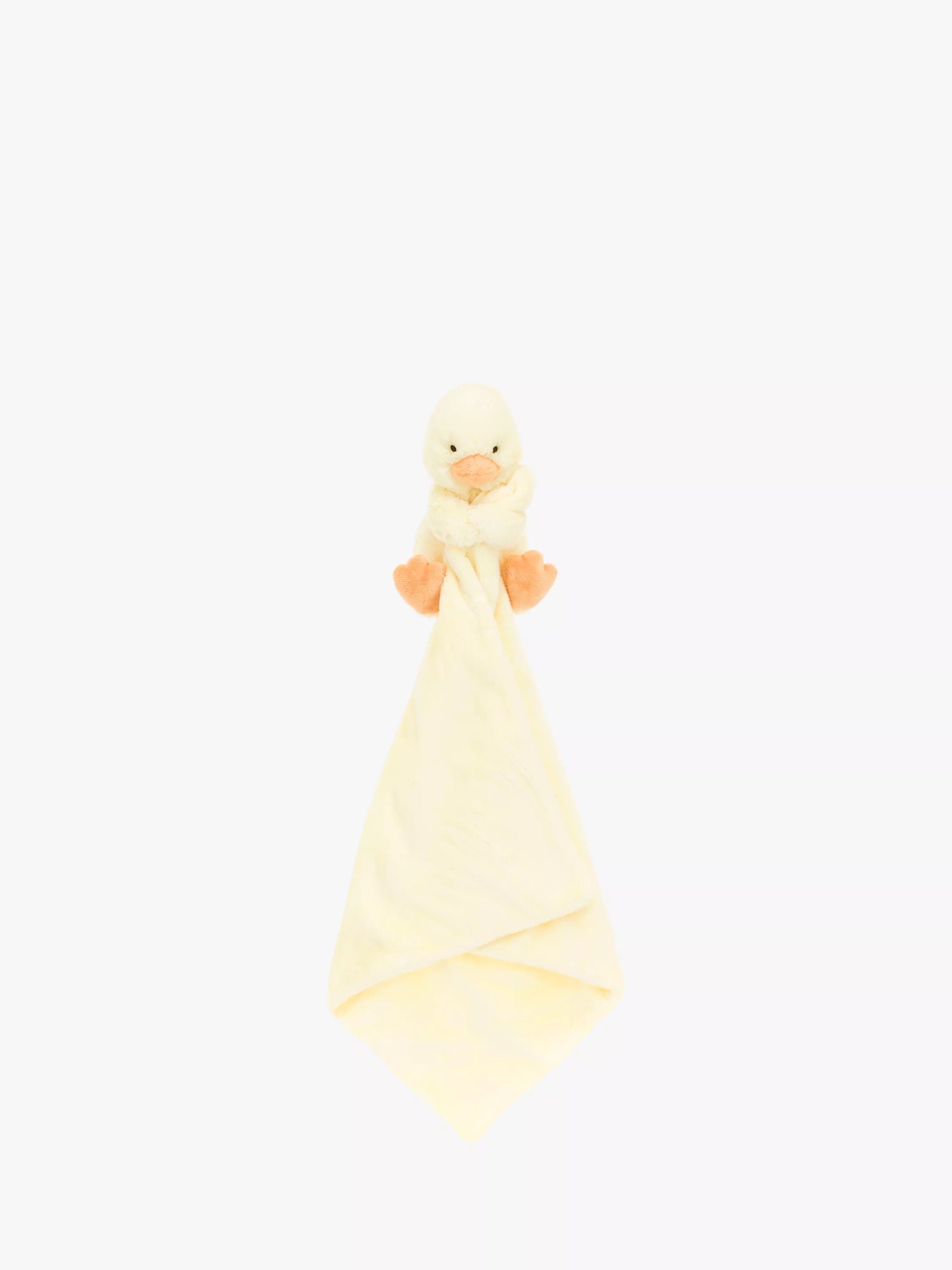 Sweet, gentle Bashful Duckling Soother is a perfect newborn gift, rolled up and presented in a Baby Jellycat grosgrain ribbon. Featuring our most loved farmyard friend, soft in a pale yellow fur made from recycled fibers and holding on tight to a smooth, un-stuffed square shaped soother; a simply gorgeous cuddle companion.