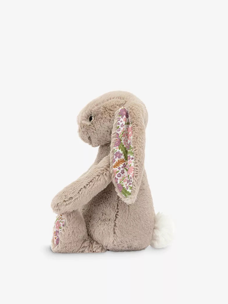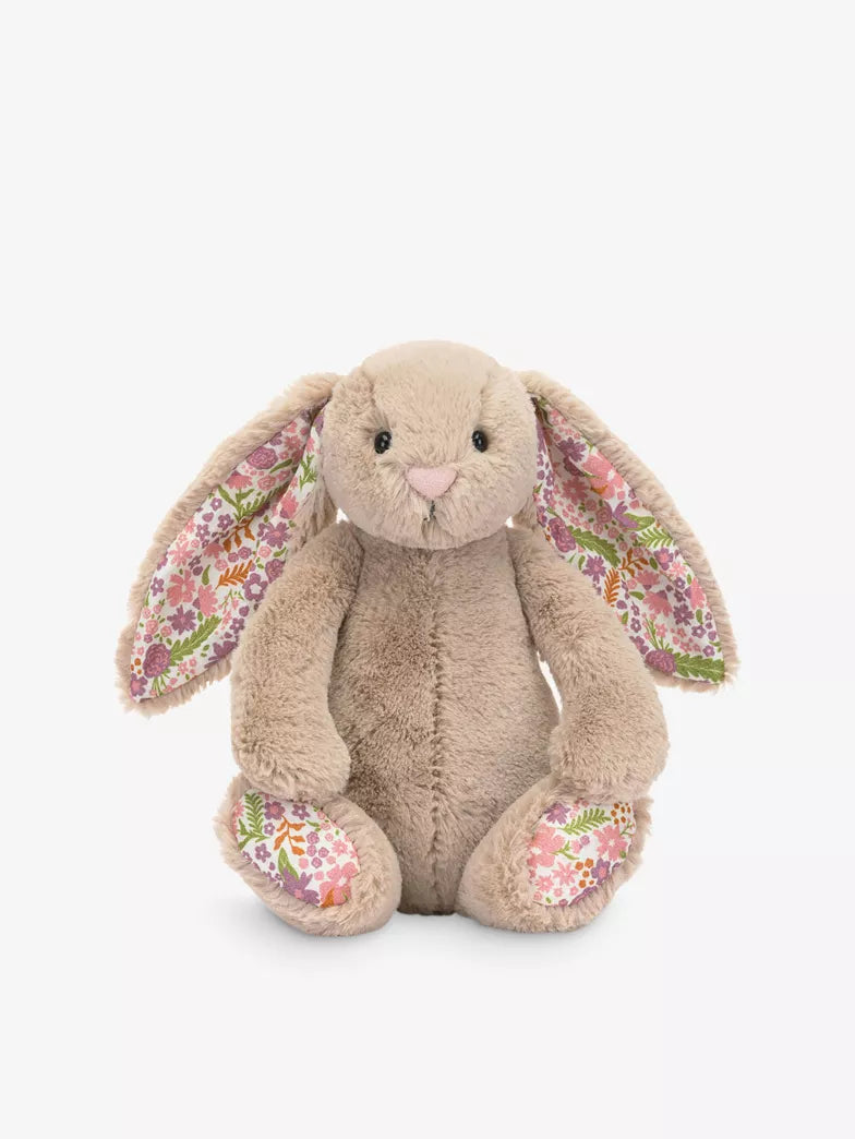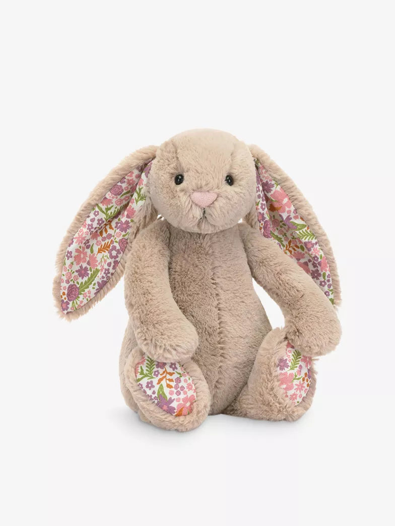 Blossom Beige Bunny has been frolicking in the meadows, and has found some special flowers. In iconic Bashful beige fur with a cream bobtail, Blossom Beige Bunny has soft cotton floral ears and feet, printed with an original Jellycat design of pink and purple flowers. Bringing floral patterned joy to all ages!