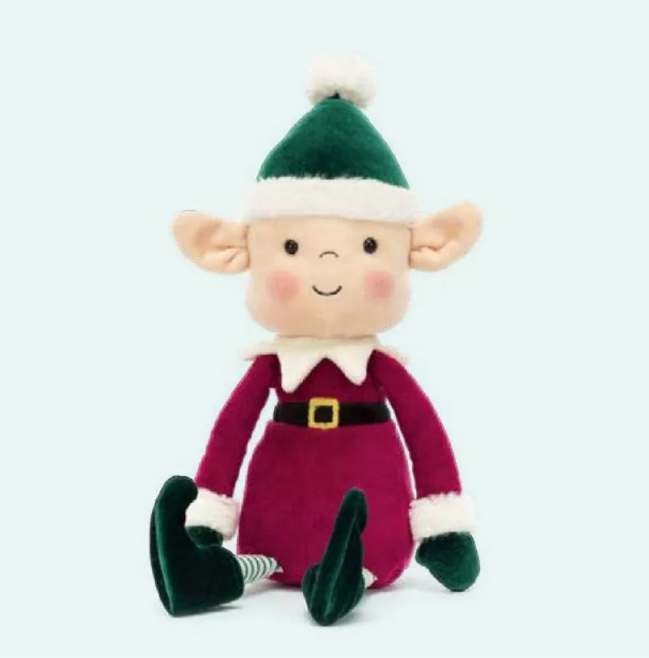Everyone needs a helper, not just Santa! Eldo Elf is a charming friend with rosy cheeks and fold-detail ears. This dandy pixie wears a mulberry suit with a cream star collar and gold-buckled belt, paired with curly velvet boots and matching ivy green bobble hat. With an affable smile, Eldo is here to boost the Christmas cheer!