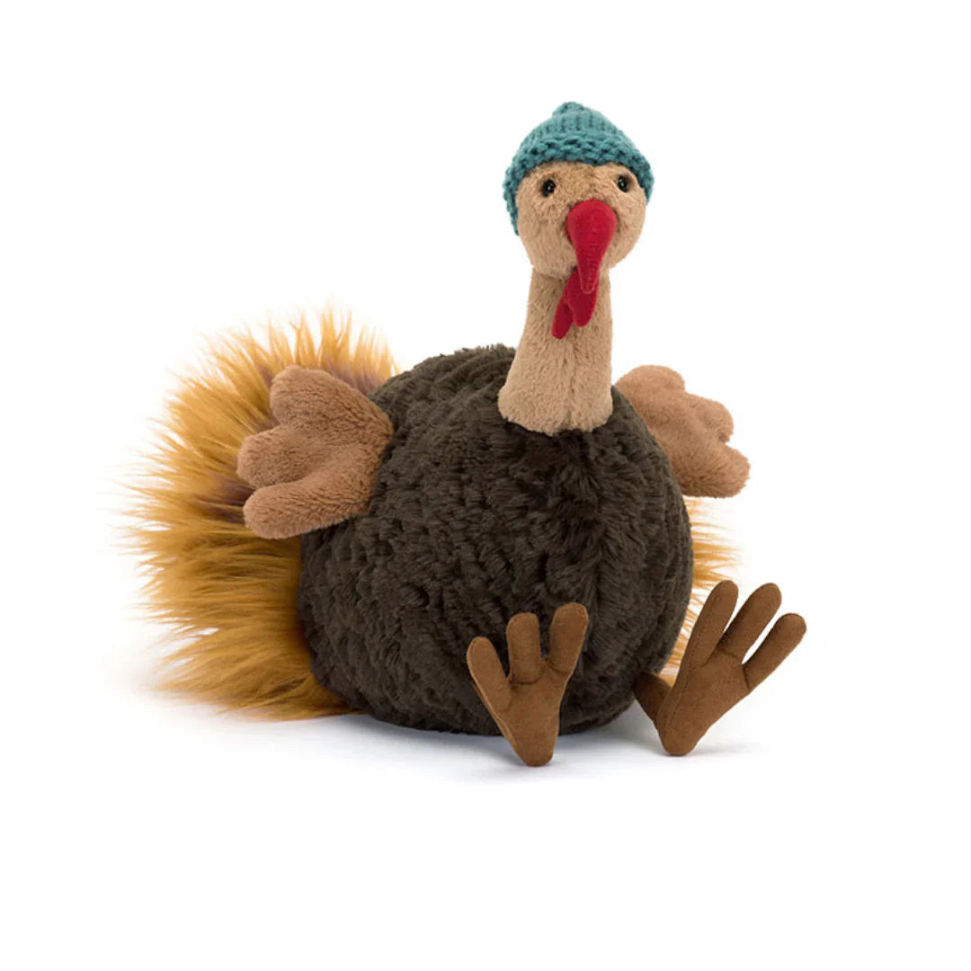Theo Turkey may have plumage, but this turkey's taking no chances. He's knitted himself a bold teal hat, ready for the winter! Theo has over-sized honey feet, a round cocoa tummy and a silky ginger tail. Most impressive of all, this proud turkey has a beautiful suedette caruncle (that's the wobbly bit under his beak). A dazzling gift for happy holidays.