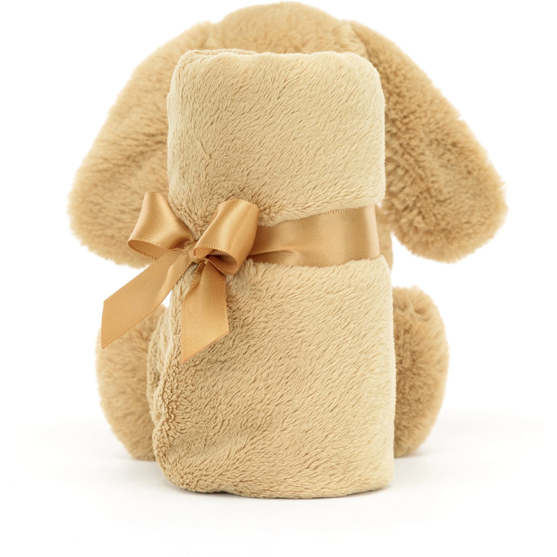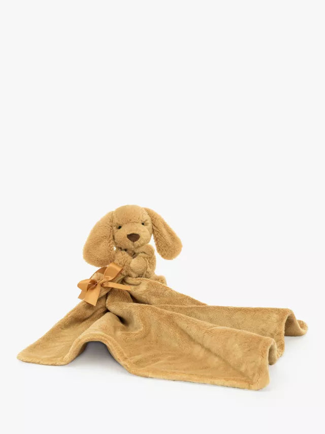 The Bashful Puppy Soother comes in toffer, with a floppy puppy pal! Soft and soothing for the sweetest sugars. Wrapped up with a matching ribbon to make the perfect gift for your favorite baby.