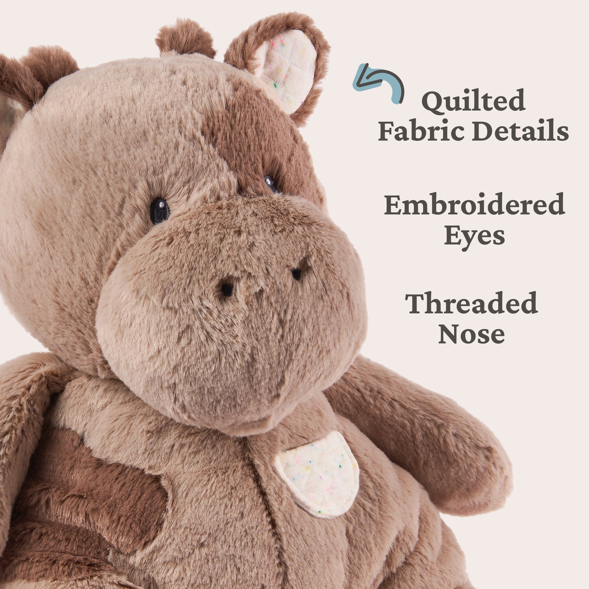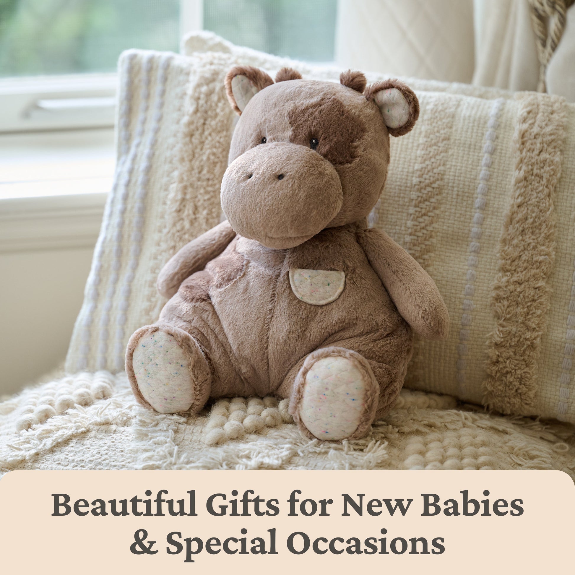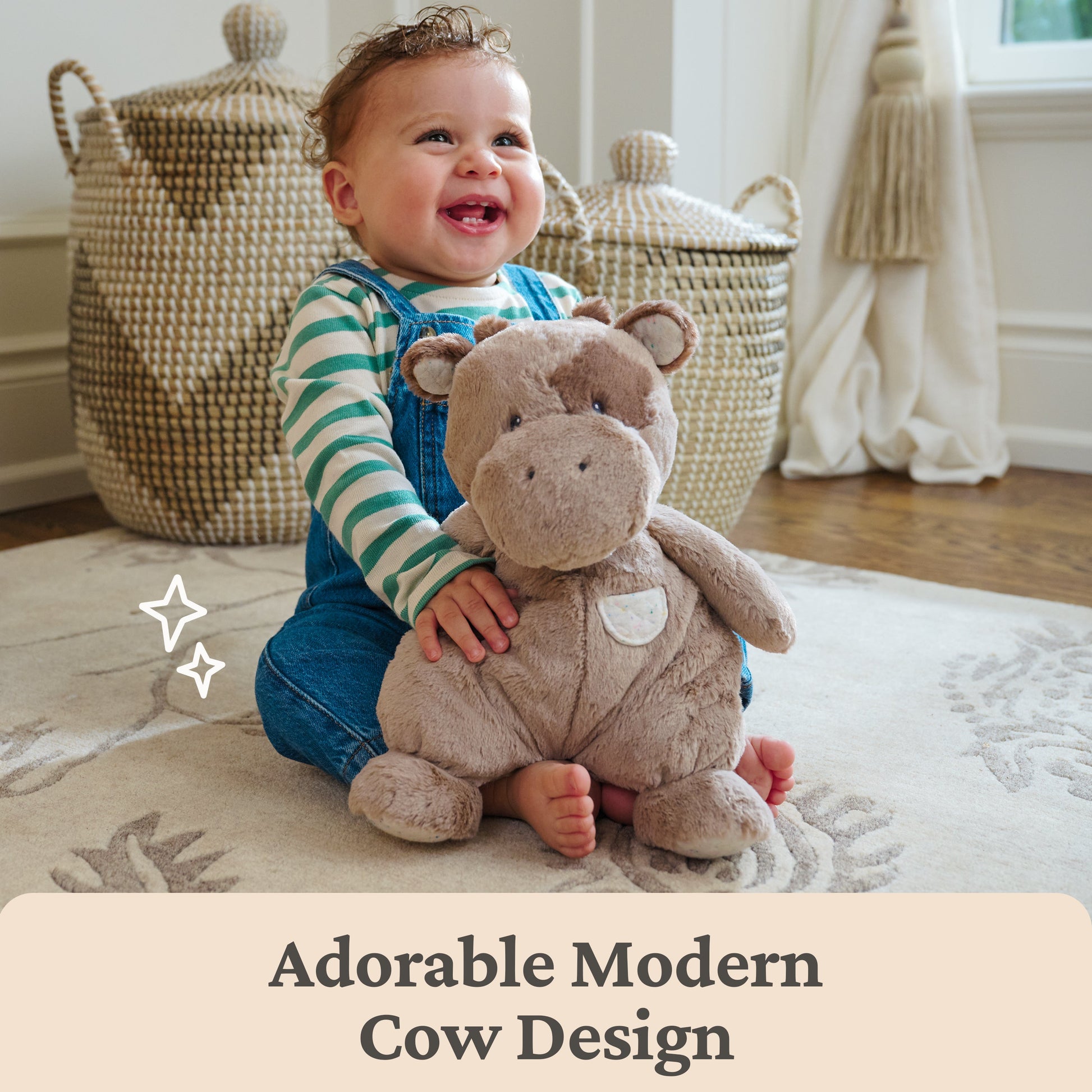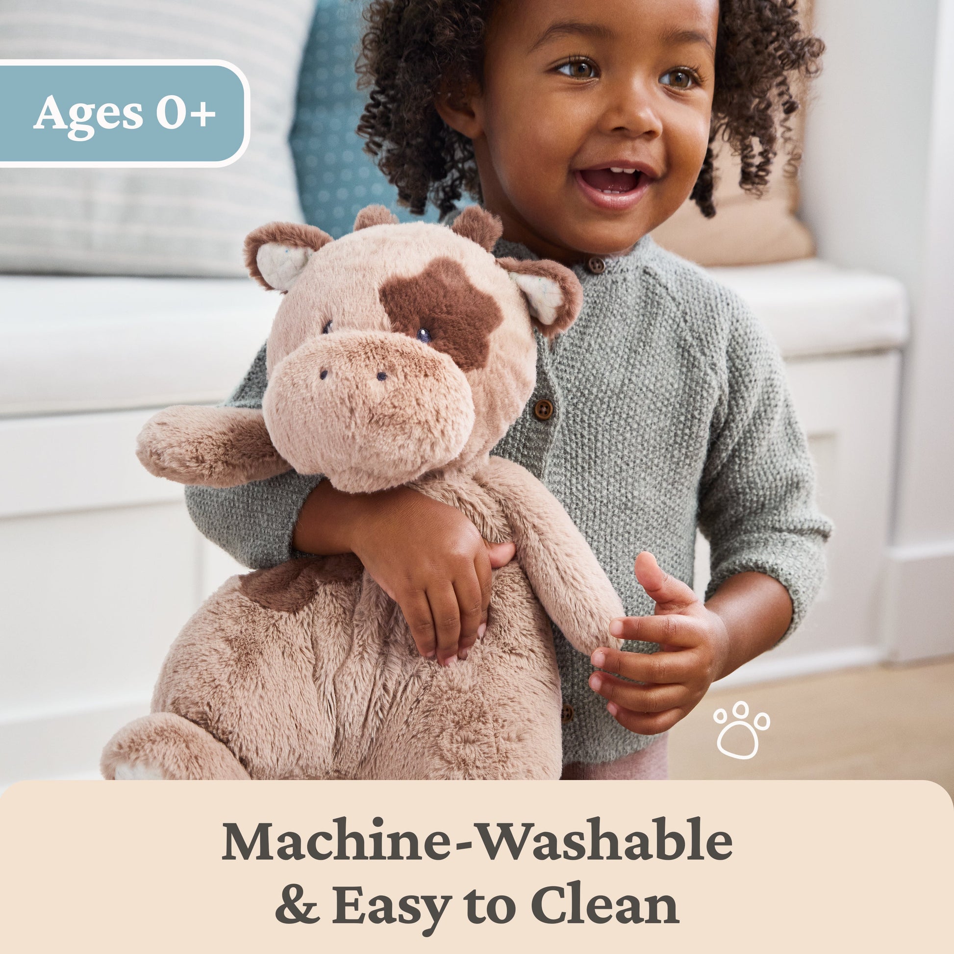 The Oh So Snuggly Collection by Baby GUND combines two of baby’s favorites: a super-soft plush friend and a quilted security blanket, all in one plush toy that comforts and supports tactile play! The Oh So Snuggly Cow is a super-soft, modern take on a classic plush cow, designed with a light brown spotted pattern in neutral mocha shades that complement modern décor of all styles. This adorable plush cow also features baby-safe embroidered facial details and quilted accents in its ears, on its feet and body with a jersey texture made to feel just like a soft, comforting security blanket. All animals in the Oh So Snuggly plush collection are machine washable for easy, convenient cleaning and appropriate for all ages, from newborns aged 0 and up. Look for more Oh So Snuggly plush pals and complete your collection or build a wonderful, whimsical baby shower gift basket!