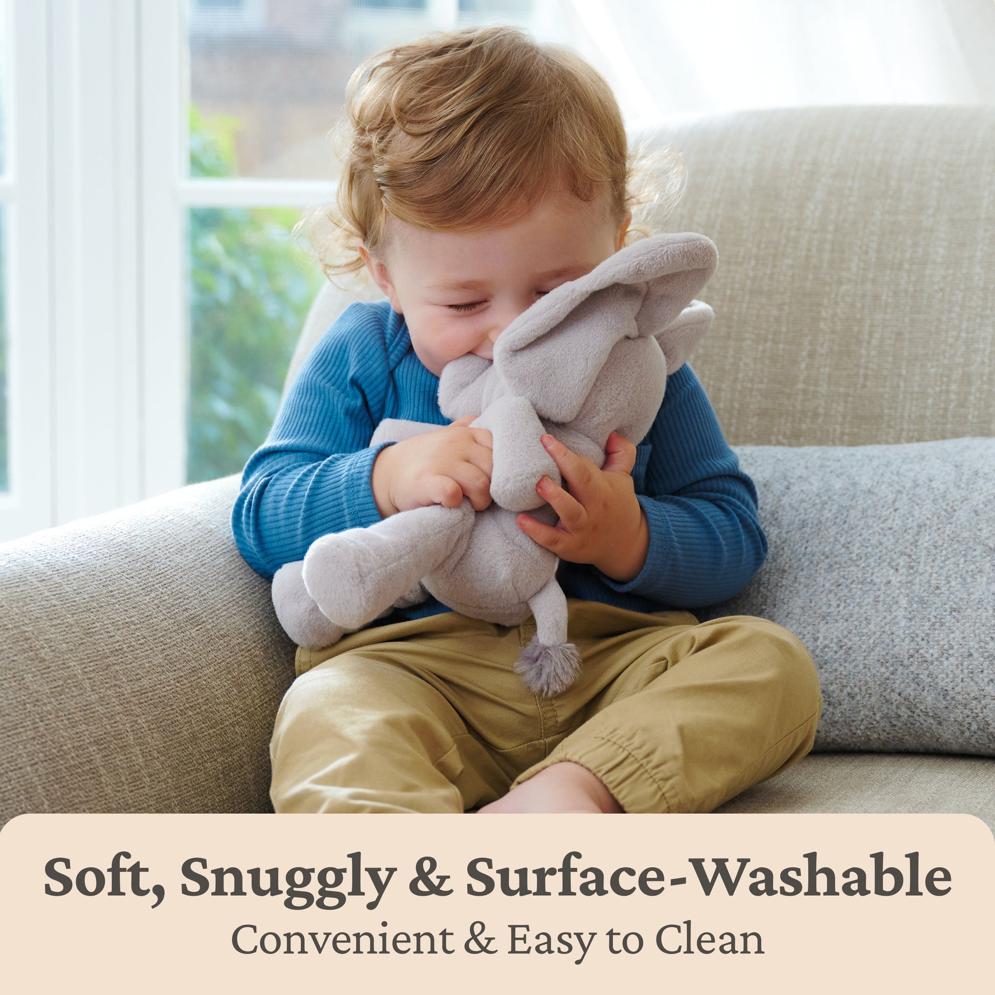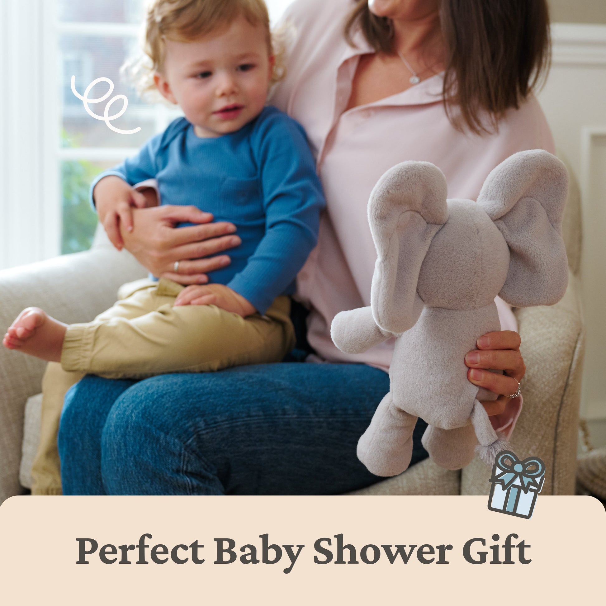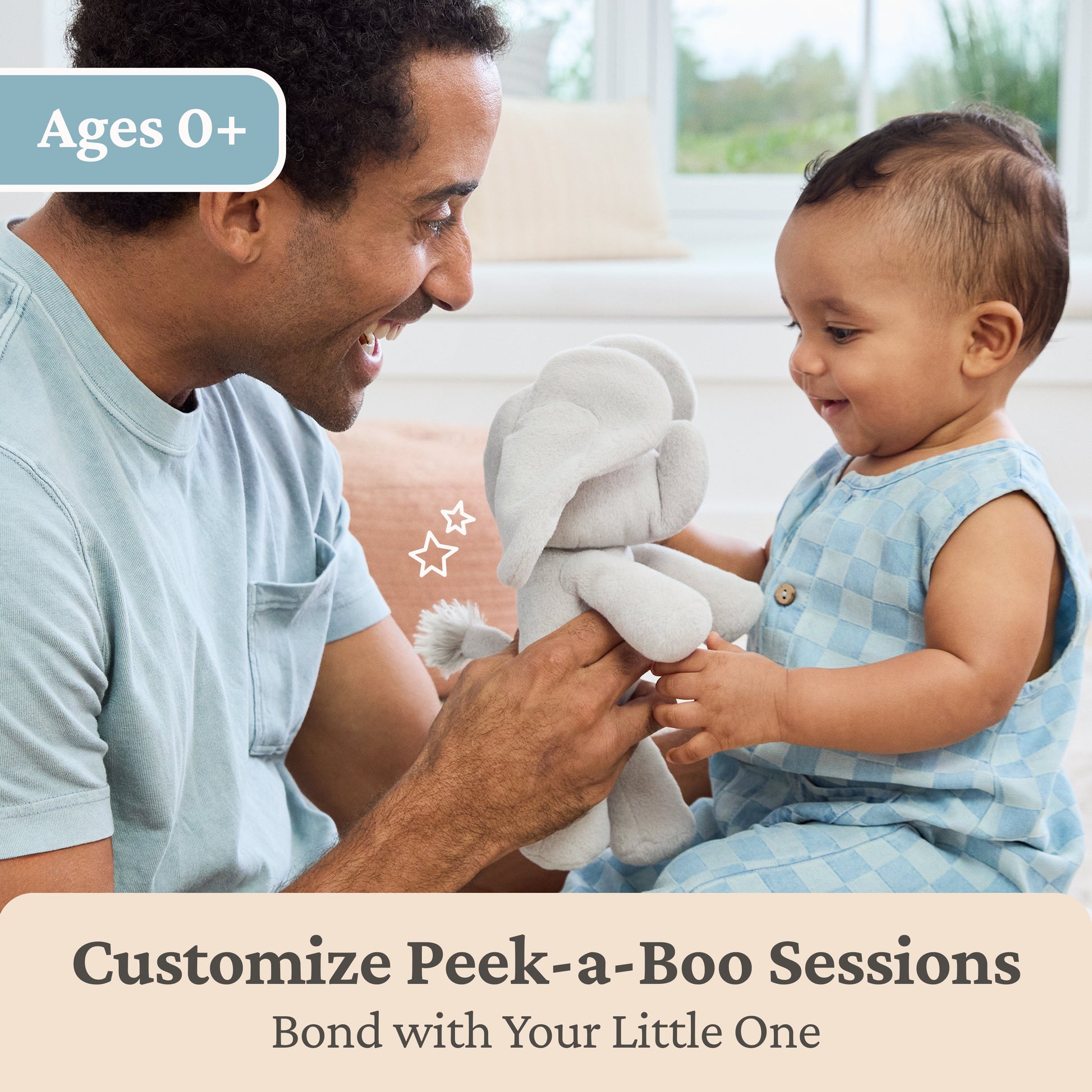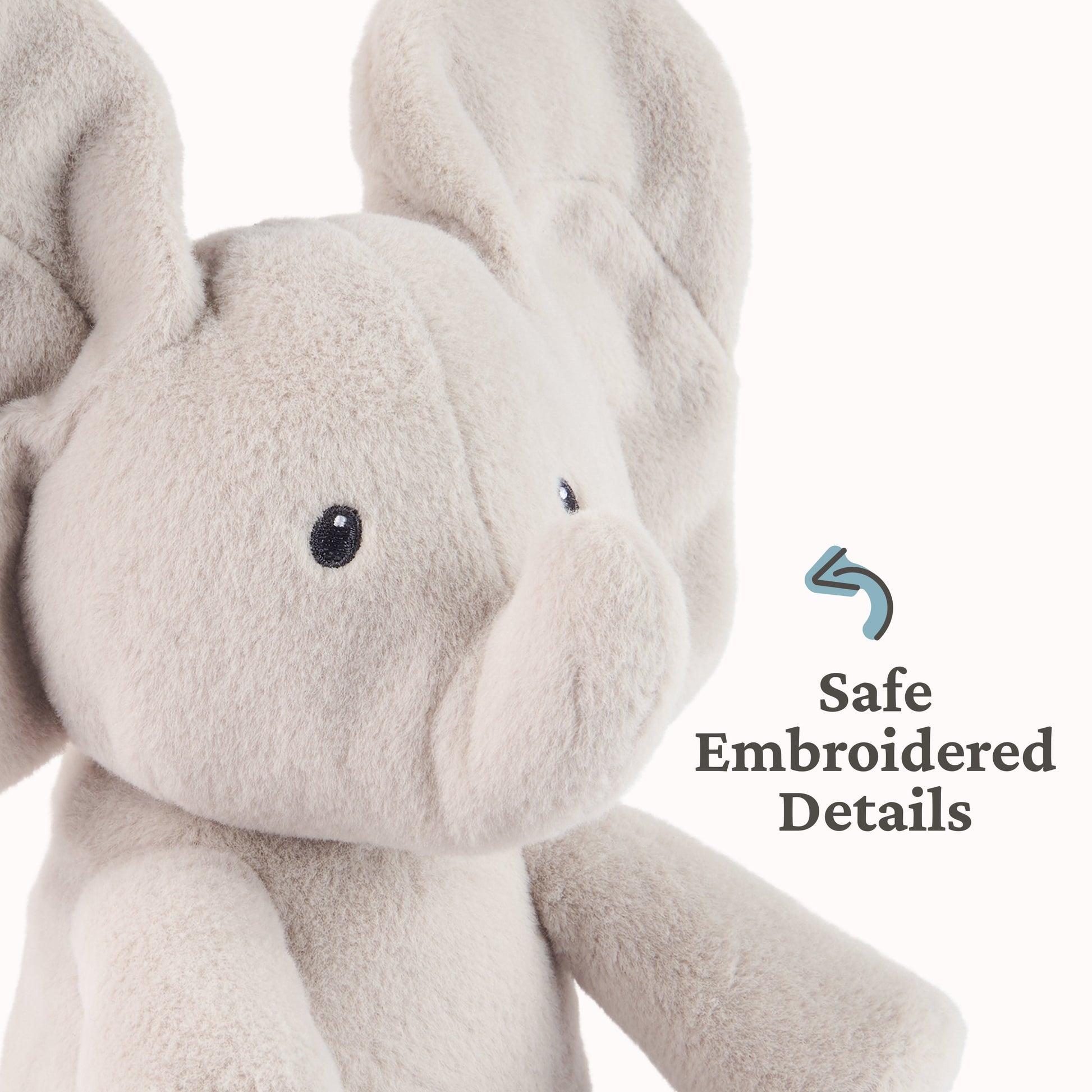 Flappy is here in an all-new format! This classic award-winning plush elephant is here in a smaller, travel-friendly size with a simpler squeeze-and-play feature that everyone can use to play peek-a-boo with baby. Simply press his tummy with a gentle squeeze and his ears flop downward, covering his eyes to hide and leaving you in control of the game. His oversized ears then pop back up as soon as you release the pressure, letting you decide when the surprise occurs. Flappy’s new 7” size and floppy limbs enable him to sit upright for display or let his legs dangle down playfully, making an adorable baby shower gift and cuddly soft toy. This innovative baby toy was also made thoughtfully, with the whole family in mind: with only minimal pressure needed to press his tummy, everyone can play comfortably and easily, from siblings all the way to grandma! Customize every peek-a-boo session to your little one’s preferences and speed, using Flappy to bond in a whole new way!