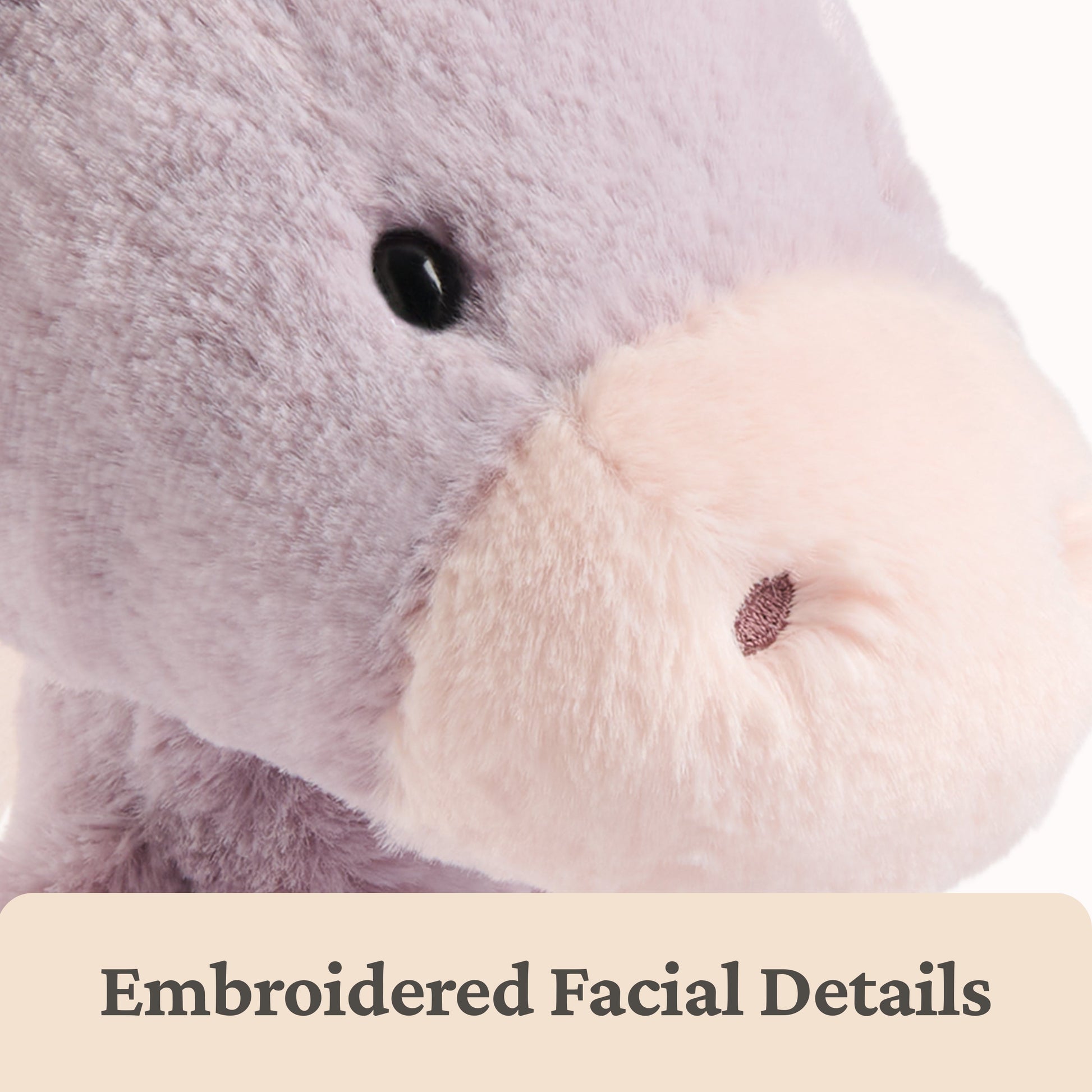 Penni is the mane attraction! This enchantingly cute 15-inch horse stuffed animal is the pasture-loving pal every adventure needs! Penni features a playfully floppy design and super-soft lilac plush with pale carnation-pink accents on her hooves and muzzle. Penni’s short, pointed ears frame a silky pink mane that complements a matching extra-fluffy tail. This pretty pony can’t wait to gallop her way into your heart and swing hoof-in-hand by your side through every playdate!