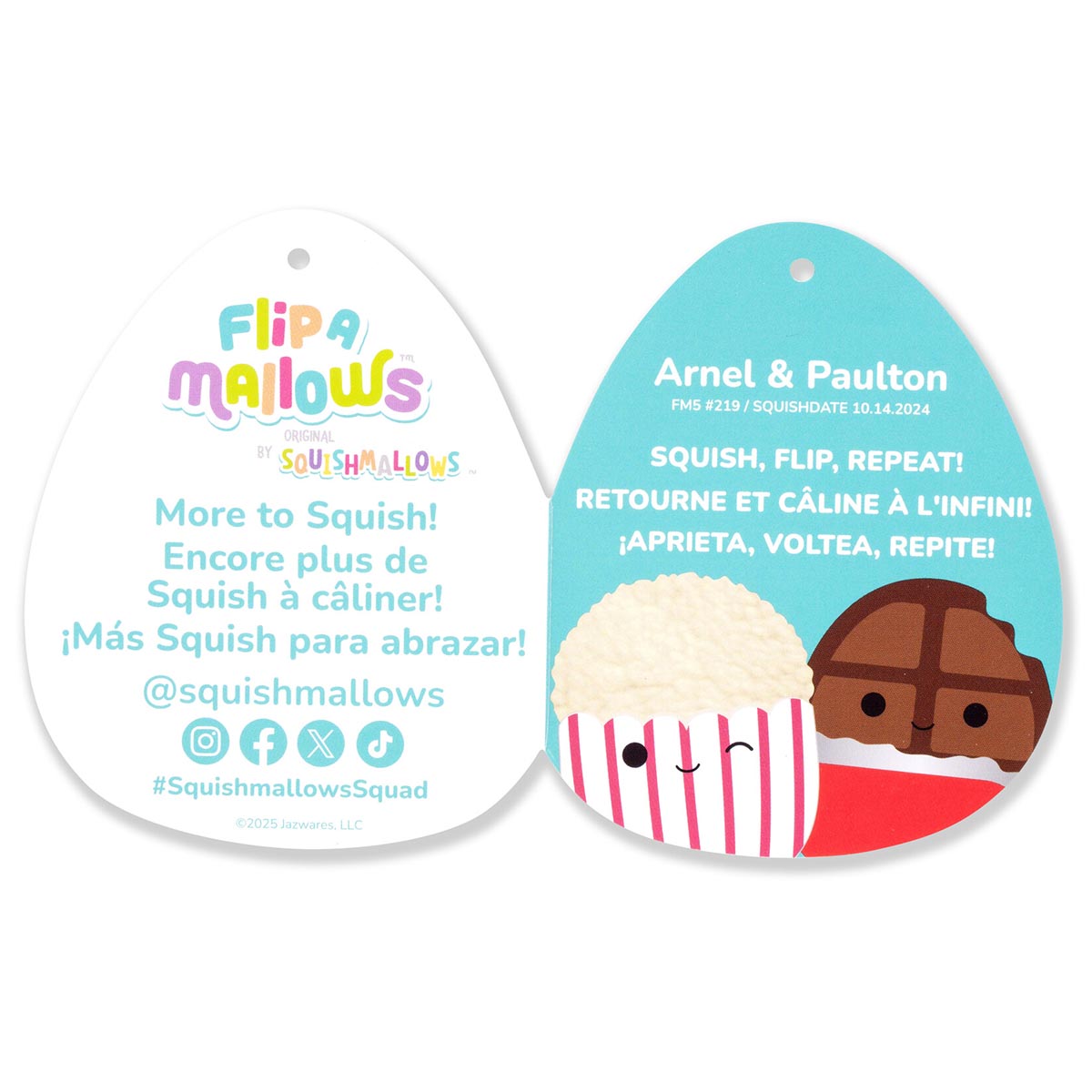 Squishmallows FlipAMallows are double the fun! This ultrasoft, high-quality plush flips between Arnel the Popcorn Bucket and Paulton the Chocolate Bar, perfect for space-minded Squishmallows fans or those who can’t choose just one. Look for other Squishmallows extensions—including FuzzAMallows, HugMees, Mystery Squad, and Stackables—only by Original Squishmallows. Join the Squad and get to flippin’ today!