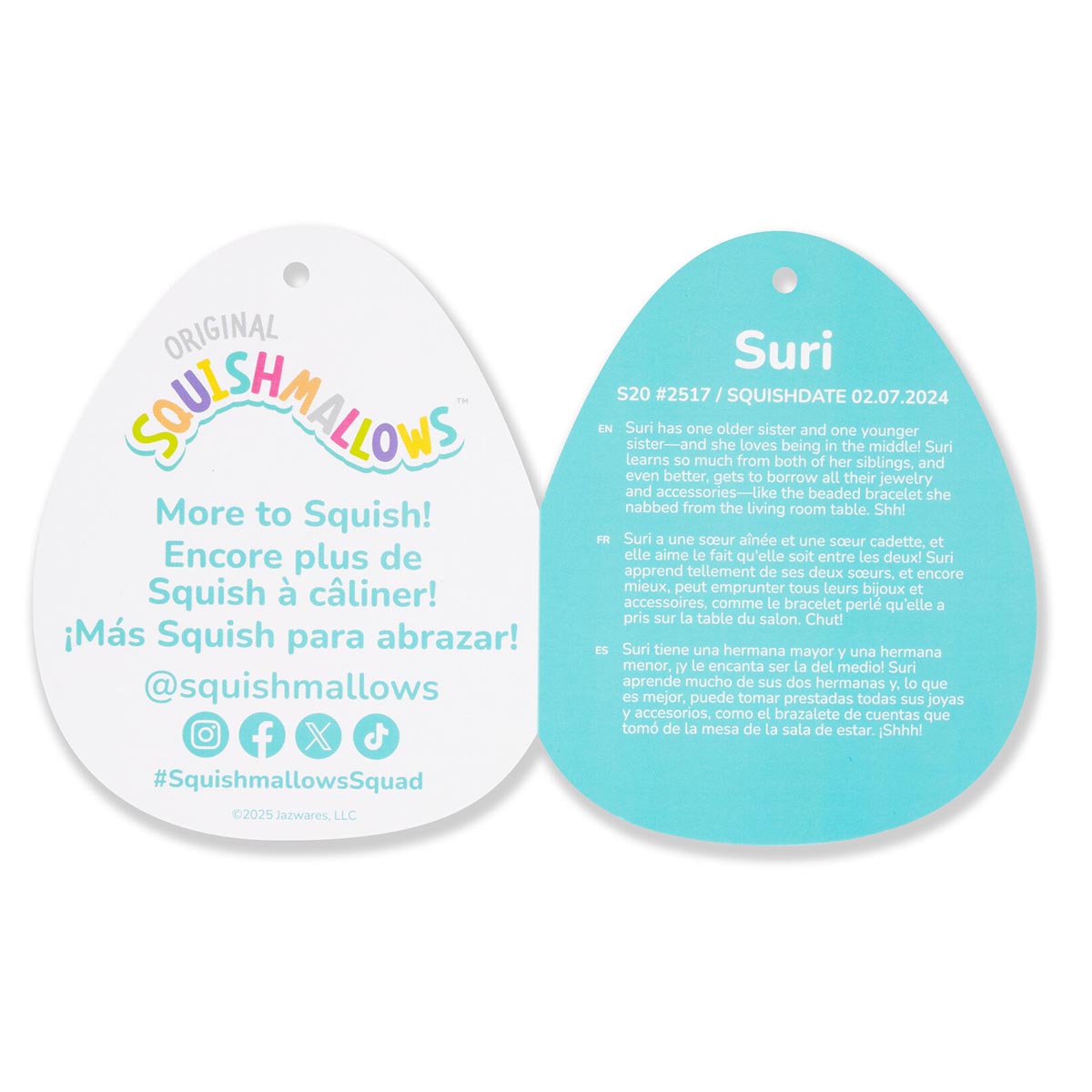 Meet your new bestie, Suri! Each Squishmallow plush comes with its own unique name and bio and makes the perfect cuddly companion for scary movies, long flights, or comfy nights in. Suri is only by Original Squishmallows. Join the Squad today!