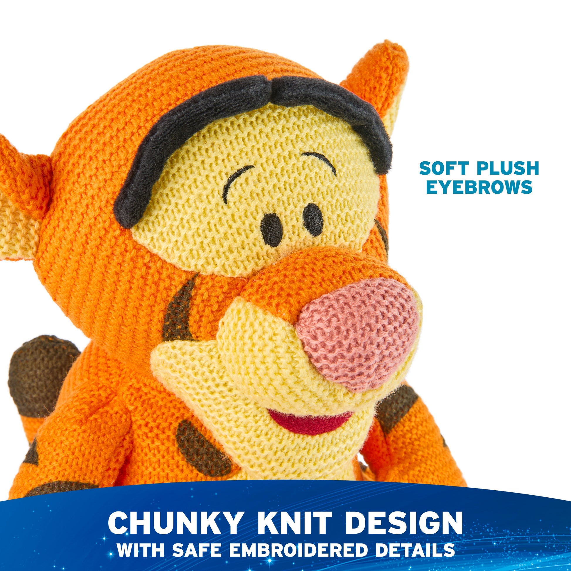 Celebrate friendship with Winnie the Pooh and all his friends from the Hundred Acre Wood! This adorable 10-inch seated plush features Tigger excitedly smiling and looking eager for a hug. Tigger features authentic character details from Winnie the Pooh, including his bright orange tiger-stripe pattern, open smile, and his expressive bold black plush eyebrows. Tigger’s floppy arms rest downward and feature adorable mitten-shaped paws. This plush is also crafted with an eye-catching chunky knit design that adds a sophisticated touch to any collection, making it not only a cuddly companion but also a thoughtful gift and an impressive keepsake for any reader or kid at heart. Each Disney GUND Winnie the Pooh plush toy ships in a protective poly bag. Appropriate for ages 1 and up. Also available in Winnie the Pooh & Piglet and Eeyore knit styles.